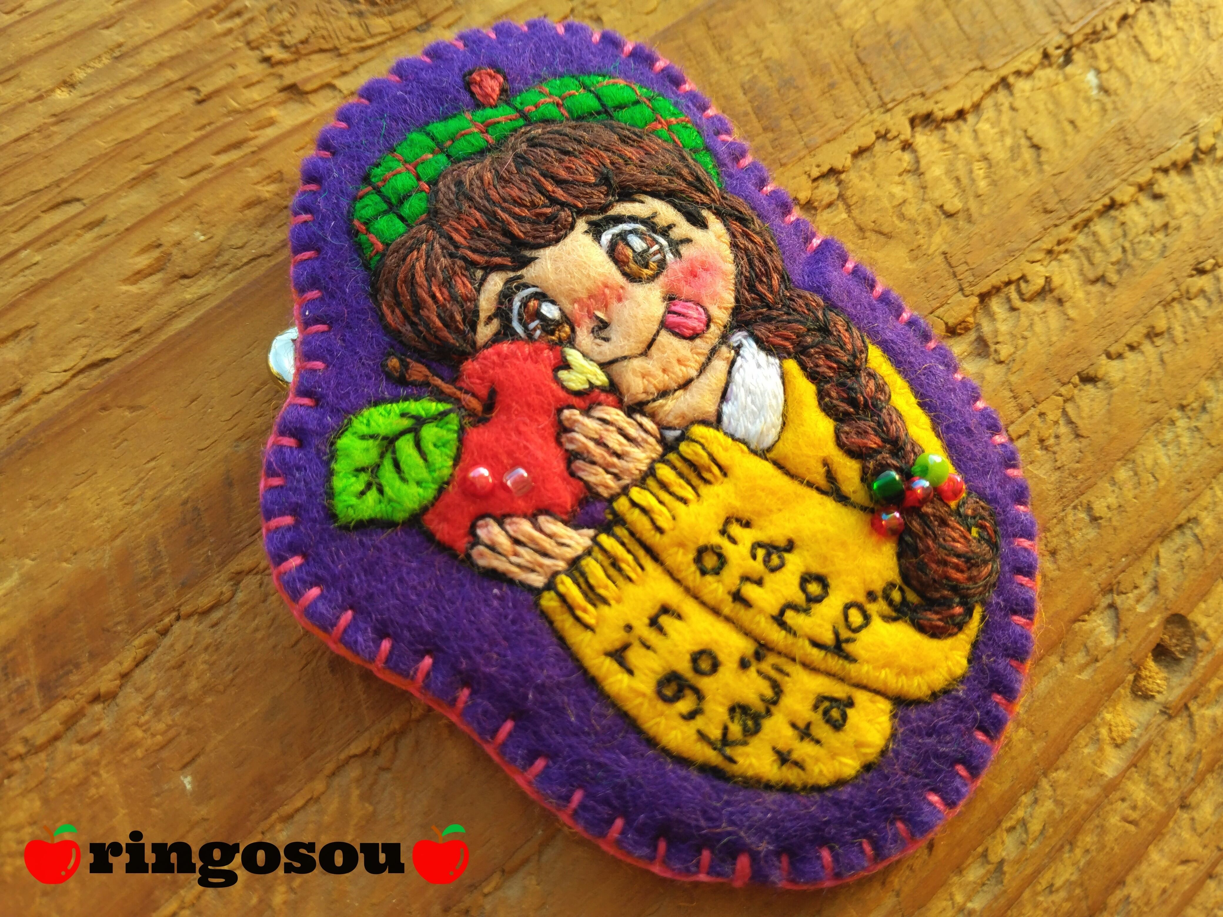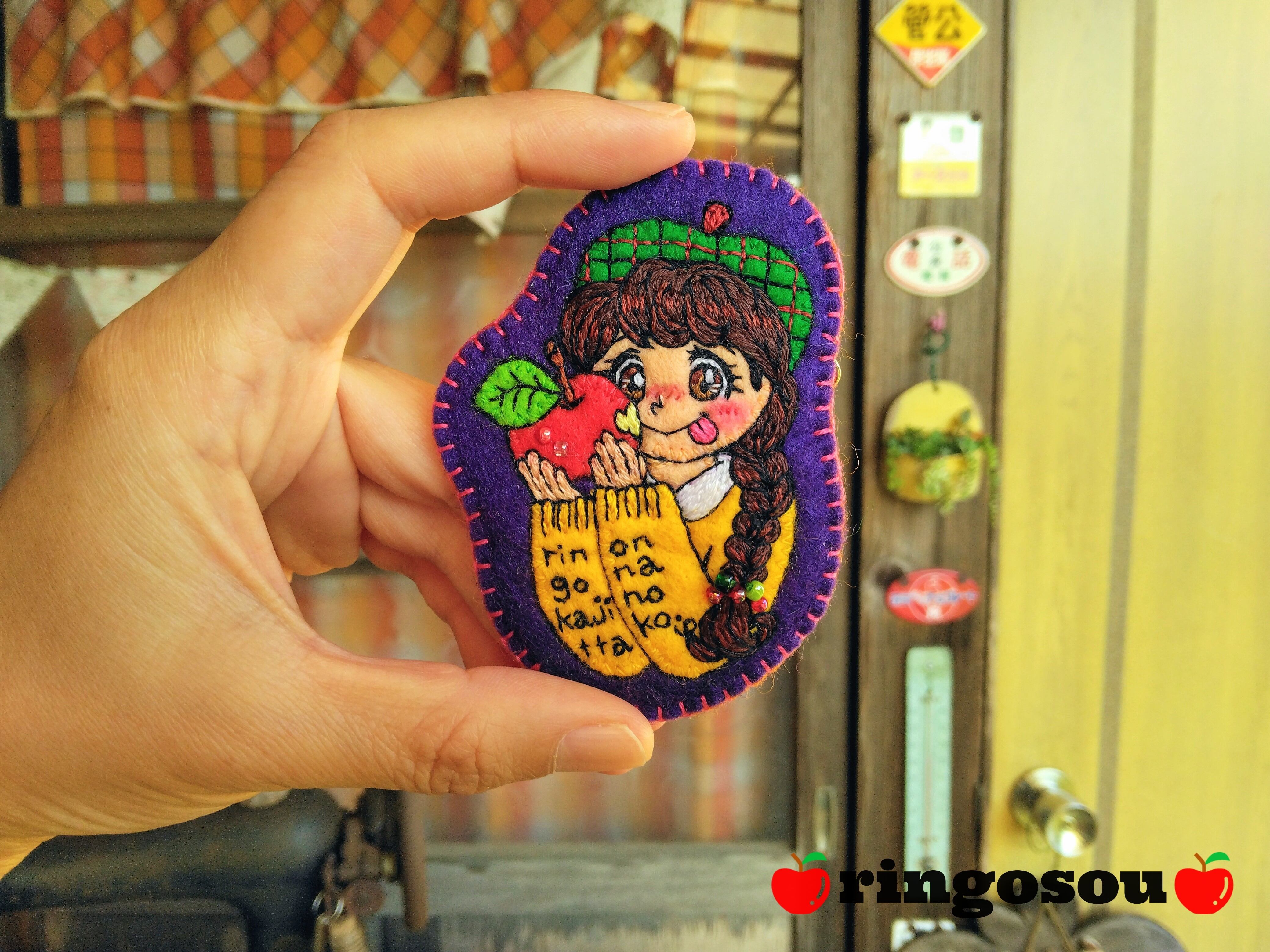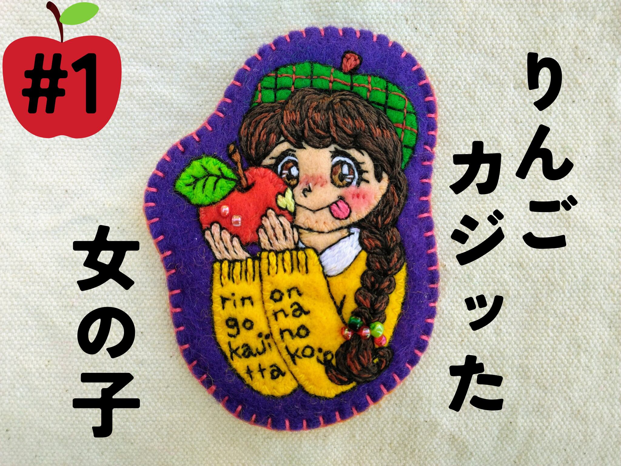 #1【りんごカジッた女の子】しりとりアップリケ刺繍ブローチ